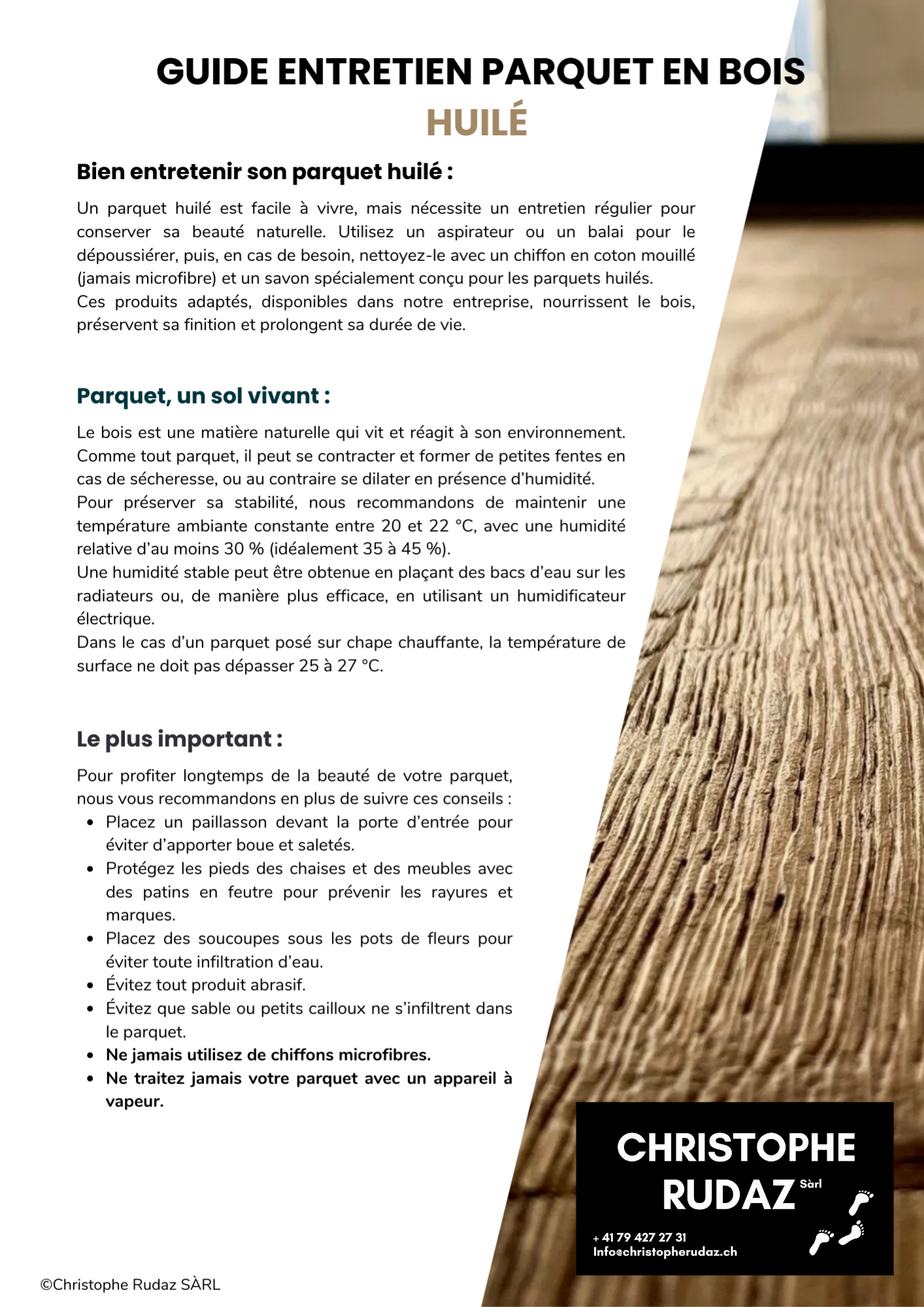 Pour toute question ou conseil supplémentaire sur l'entretien de votre parquet, n'hésitez pas à nous contacter : info@christopherudaz.ch